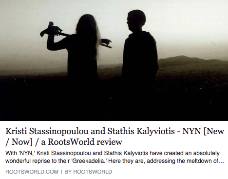 “With ‘NYN’, Kristi Stassinopoulou and Stathis Kalyviotis have created an absolutely wonderful reprise to their Greekadelia. Here they are, addressing the meltdown of Greece by offering music of incomparable beauty and inventiveness. No one I know has combined psychedelica and traditional music like this duo. But still, I unwrapped this CD expecting a letdown. After all, almost every other contemporary Greek artist has been drawn in to the maelstrom of the financial crisis that has been ravaging the country since 2011, forcing them to either write some kind of agitprop blandness or to withdraw completely. Artists have been twitter-bullied because of their positions regarding the crisis. Others have stopped getting music out for financial reasons or because, frankly, who cares about art when people are going hungry all around us? It’s very difficult to produce music when as an artist you seem irrelevant and when your audience cannot buy it. According to a recent survey, each record is expected to sell around 1,000 copies. Yet, this music comes pouring out of the speakers…”